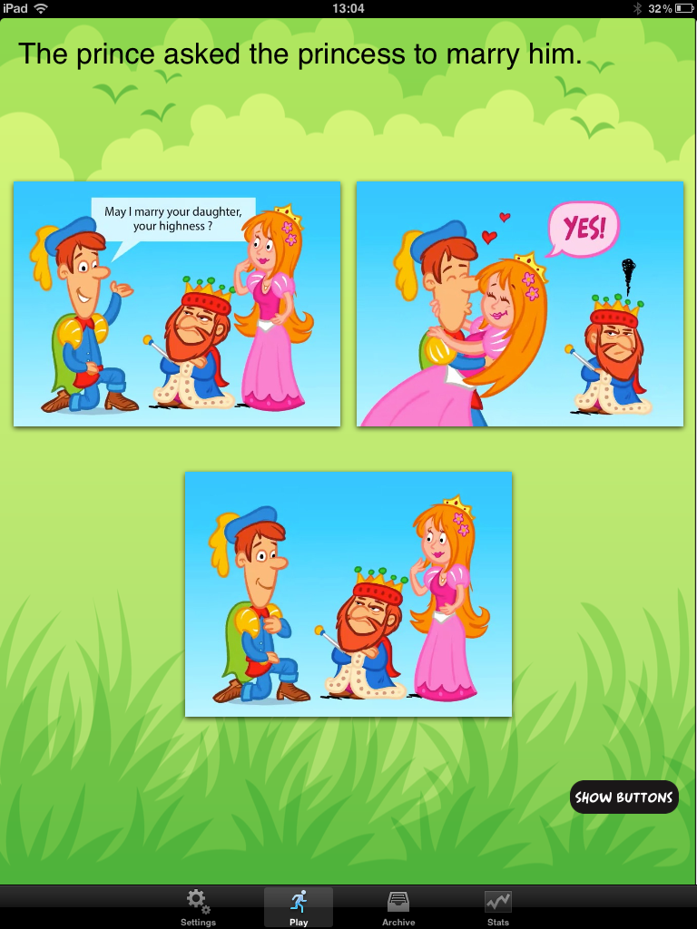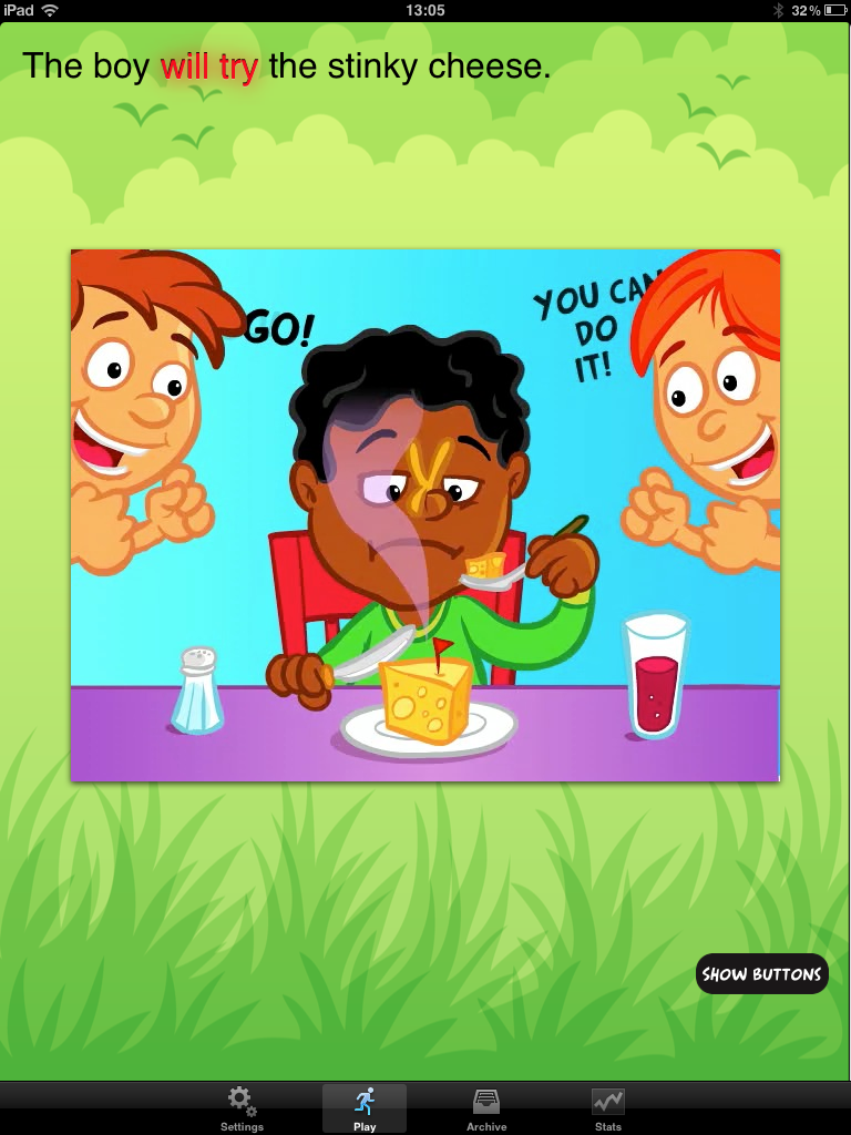 – If the child makes an error, it says “that’s not quite right”. The App zooms in on the picture and explains WHY the picture is the incorrect choice. When the child selects the correct picture it reinforces by saying “that’s right” and explains the tense and what it means.