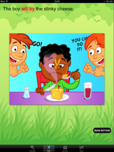 – After the video it will give the child a picture from the video and 3 – 7 word choices (you can set the amount of choices in the settings) and they have to drag to correct verb tense into the sentence that corresponds with the picture.
