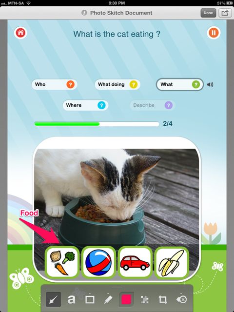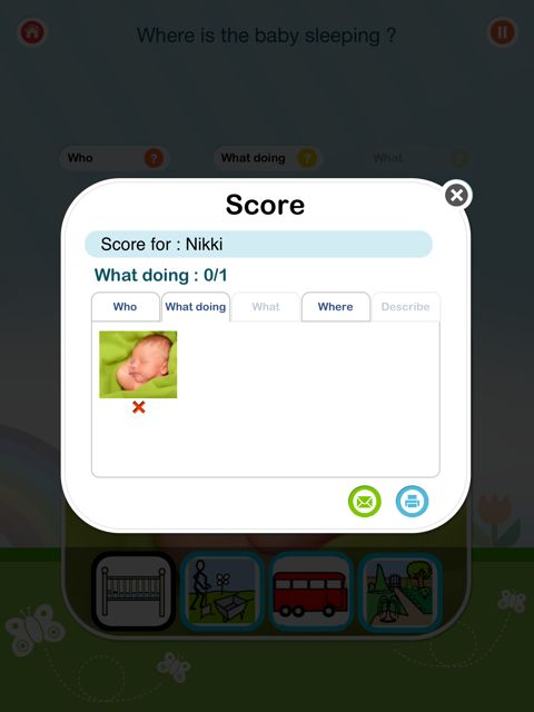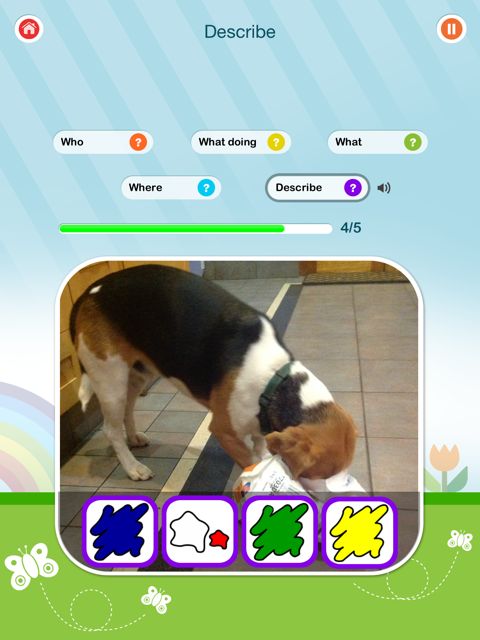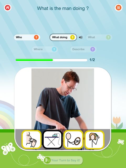 The app prompts the user with “your turn to say it”. A record feature at the answer level to assist kids in self – monitoring their own productions would be beneficial. Related to this issue, is the “pause” button, which doesn’t work once the child has selected an icon. Many children require prompting or time to process information and before they have had their “turn to say it”, the app had moved onto the next item.