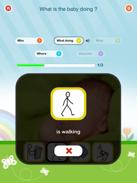The ‘who is’ in the picture is limiting. It would be nice if additional grammatical elements are added to introduce is/are which is such a difficult concept for so many children.