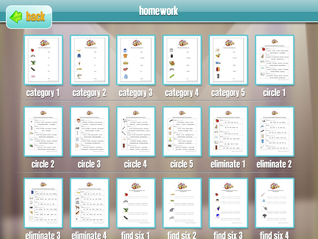 The app has 34 worksheets of various skill levels are included that reinforce the concepts addressed throughout the game. These include the following areas: