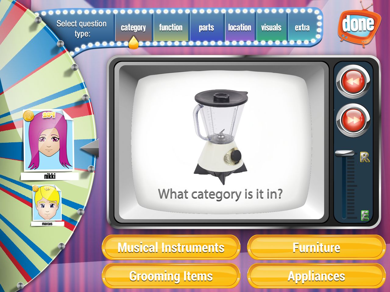 The App is presented as a game show and the wheel selects the player to begin.