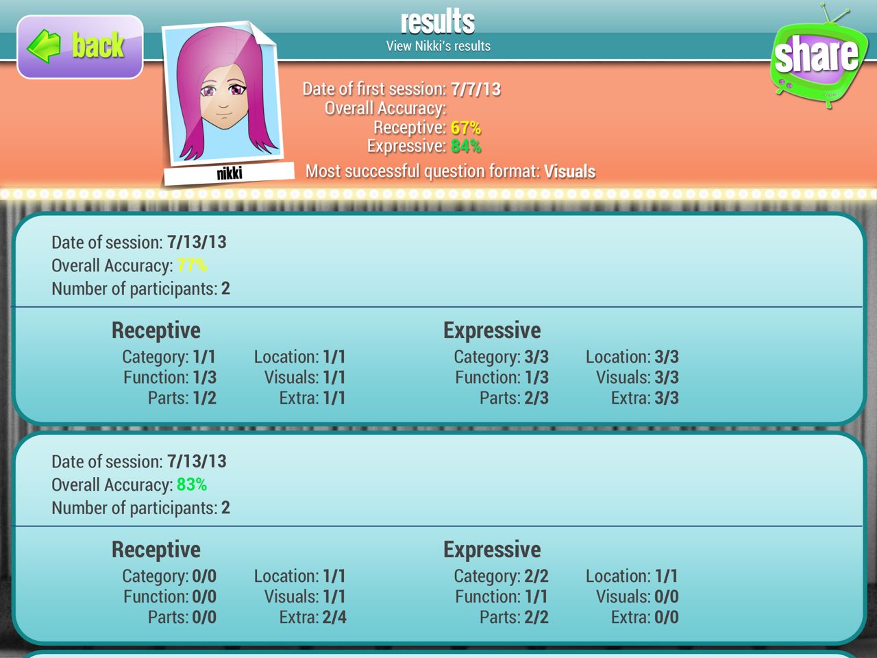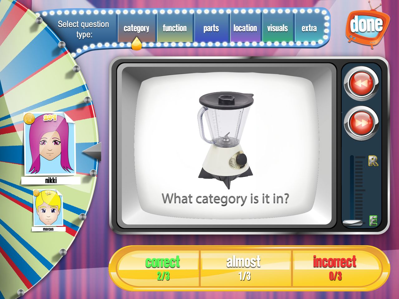 The clinician chooses the type of questions asked. For example you can choose to only ask the name of the category for different pictures or you can go through the whole set of questions with the same picture. The student is awarded a trophy based on a TV theme (e.g. Best Home Improvement Show) when they obtain 10 consecutive correct answers.