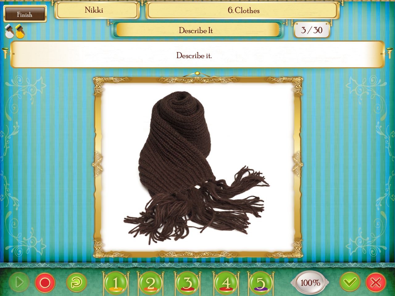 The student is shown a picture and asked to describe it. The response can be recorded by tapping the record button. If the student has difficulty generating a response independently, then prompts are given by tapping on the numbers below the picture.