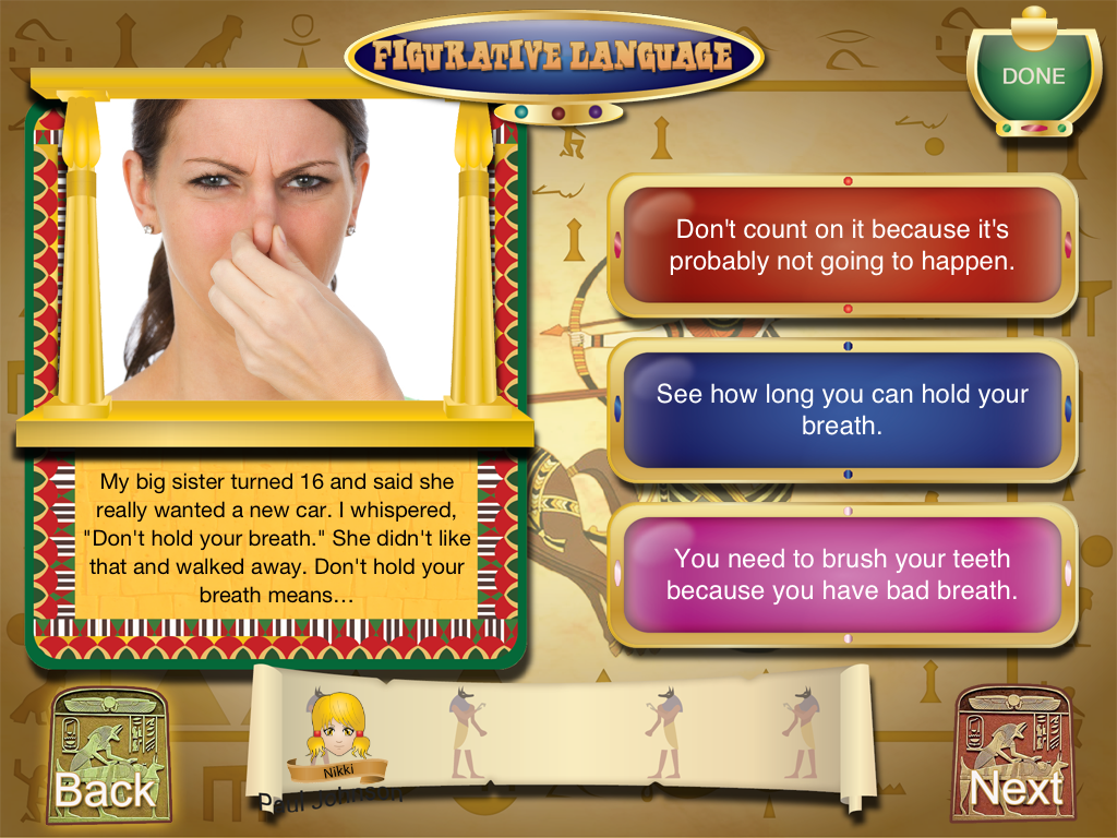The student is given a situation and then a choice of 3 options to choose from. For example “Don’t hold your breath” means: