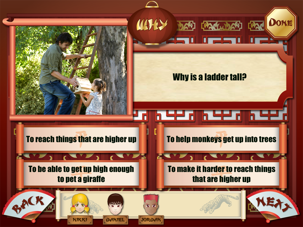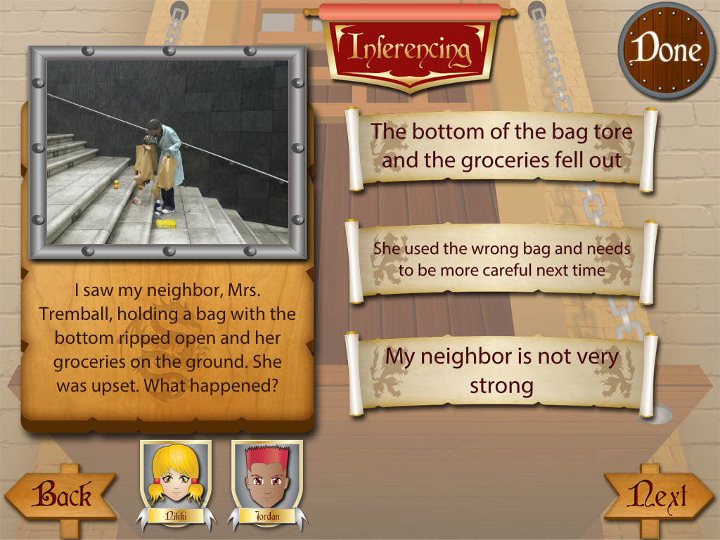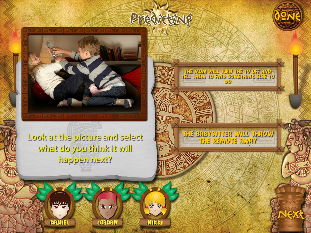 The student is required to look at the picture which may have a short narrative attached and select what will happen next. Level 1 the student has two possible choices. Level 2 has three possible choices and Level 3 has four possible choices.