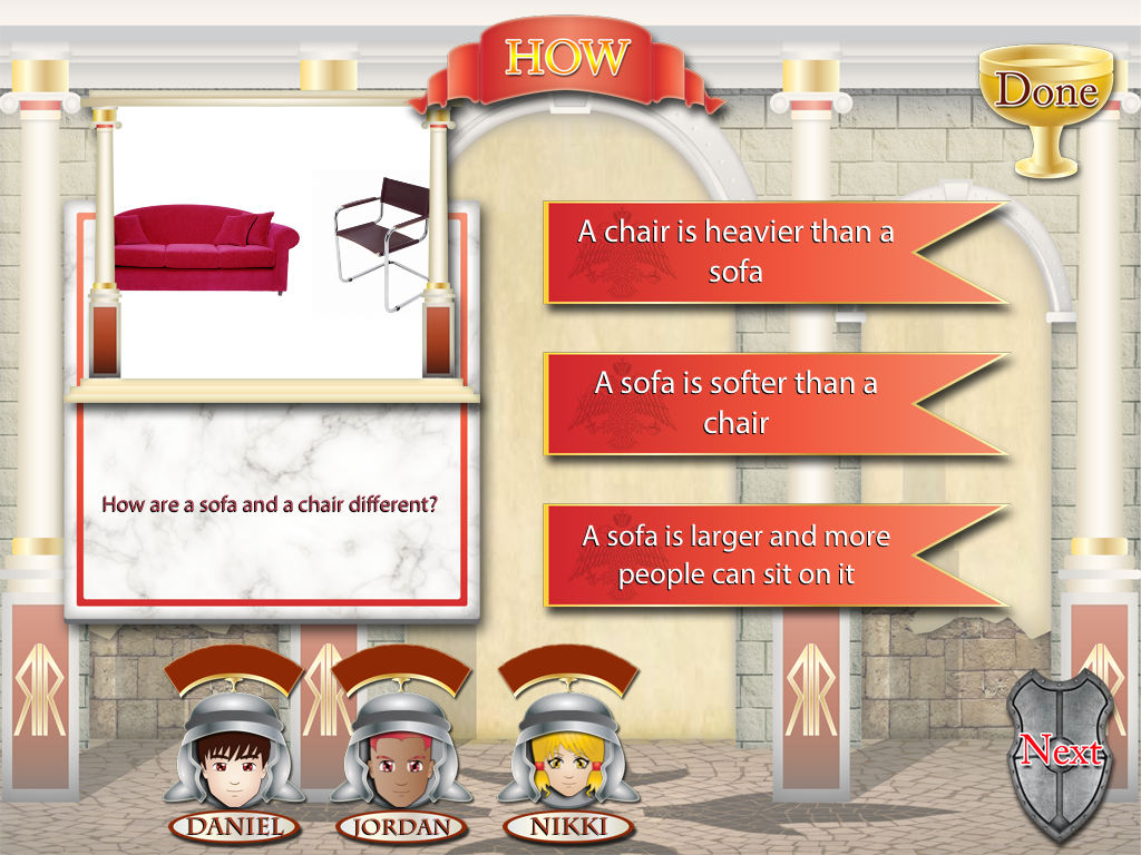 The student selects the correct answer from three possible options. The “how” questions target issues such as social skills, comparing and contrasting and emotions